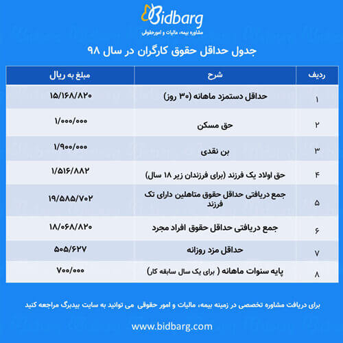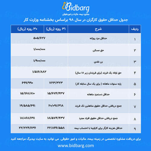 جدول و بخشنامه کامل حداقل حقوق و مزایا در سال 98 بیدبرگ مشاوره بیمه و قانون کار
